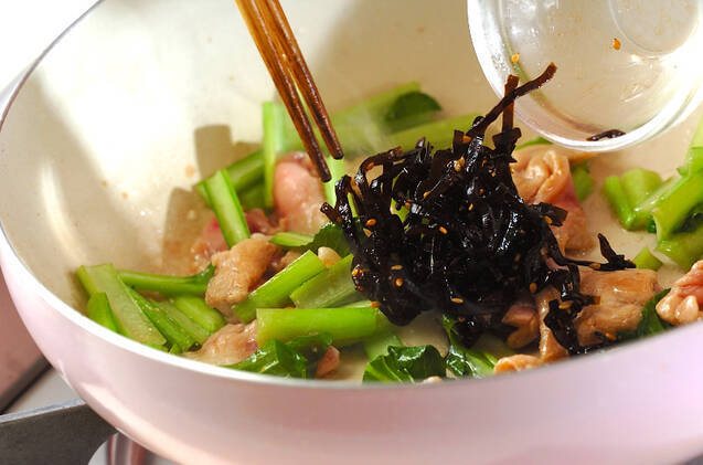 フライパンにサラダ油を熱し、豚肉、小松菜の茎、ニンニクを炒め合わせる。豚肉に火が通ったら小松菜の葉、昆布、酒を加えて炒め合わせ、塩で味を調えて器に盛る。