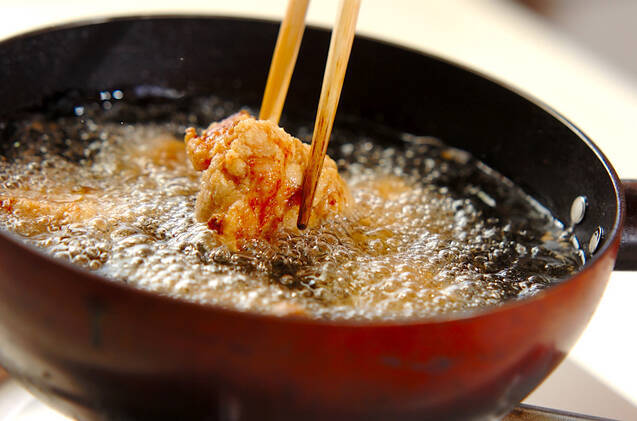 鶏もも肉の汁気を軽くきって片栗粉を薄くまぶし160℃の揚げ油でじっくりと揚げ、油をきる。