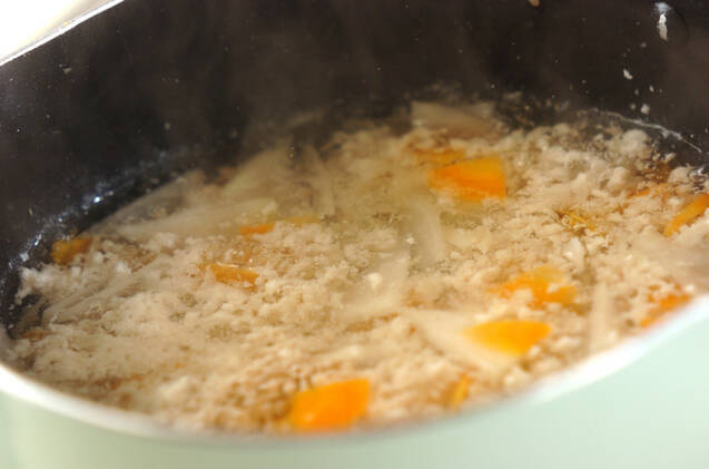 鍋に<スープ>の材料を入れて強火にかけ、煮たったら鶏ひき肉、大根、ニンジンを加える。再び煮たったらアクを取り、2~3分煮る。