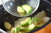 アボカドは種に沿って、縦にクルッと1周切り込みを入れる。両手の平ではさみ、両側から押さえ付ける様にねじり、2つに分ける。包丁の角を種に刺してねじり取り、皮をむいてひとくち大に切り、レモン汁を加えて混ぜる。