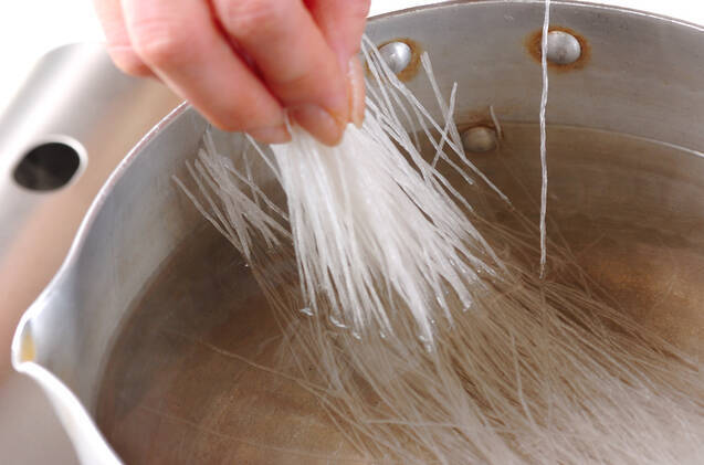 春雨は袋にある表示時間通りにゆで、ザルに上げて水で洗う。よく水気を切って、食べやすい長さに切る。