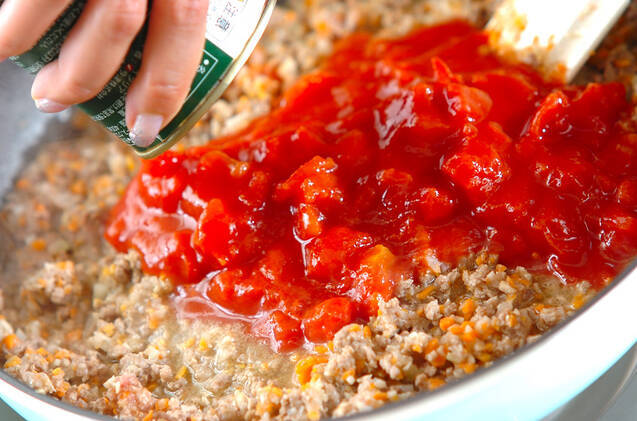 2に水煮トマトとローリエ、顆粒スープの素を入れ、ひと煮たちしたら塩コショウで味を調えて、ミートソースのできあがり。※水煮トマトがホールの場合はつぶしながら加えて下さい。