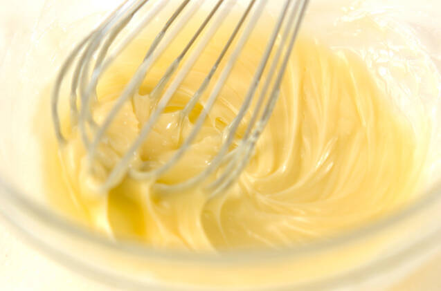 ボウルに無塩バターを入れ、なめらかになるまで泡立て器で練り、さらにハチミツを加えて白っぽくなるまですり混ぜる。