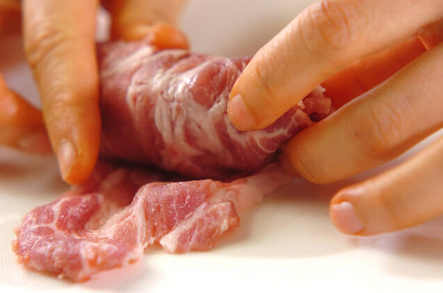 <野菜の肉巻き>を作る。ニンジンとエリンギは長さ4cmに切り、さらに火が通りやすい太さの棒状に切る。豚肩ロース肉の上にニンジンとエリンギをのせ、野菜が出ないように巻く。