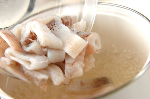 鍋にだし汁200ml、<調味料>の材料を入れて強火にかけ、煮たったらイカを入れる。再び煮たったら中火にして2分煮て、いったんイカを取り出す。