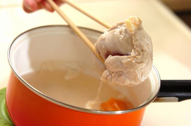 鍋に水、鶏むね肉、ニンジンを入れ、蓋をして火にかける。沸騰したら鶏むね肉をひっくり返し、火を止めて余熱で火を通す。