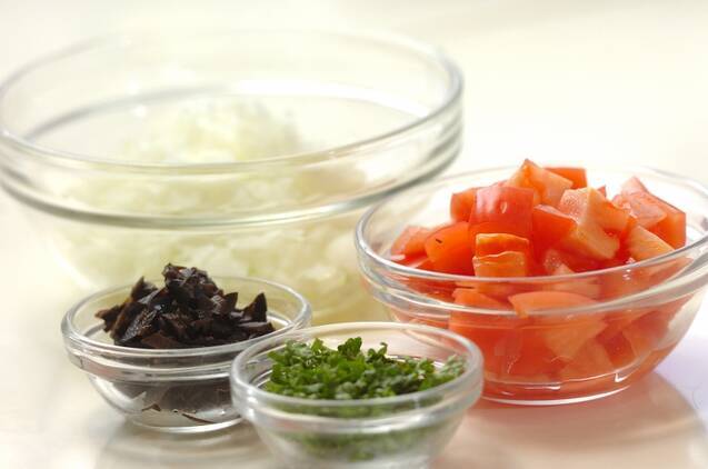 トマトはヘタを取って1cm角に切る。玉ネギとブラックオリーブはみじん切りにする。<ソース>の材料を混ぜ合わせる。