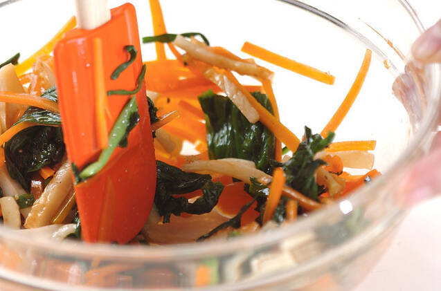 <合わせダレ>のボウルにニラ、ニンジン、ちくわを加えて和え、器に盛る。