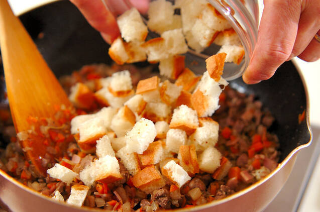 熱したフライパンにオリーブ油を入れ、(2)の鶏レバー、ベーコン、ニンニク、玉ネギ、セロリ、ニンジンを炒め、レモン汁以外の<調味料>の材料を加える。材料に火が通ったら火を止め、バゲット、パセリ、レモン汁を加える。