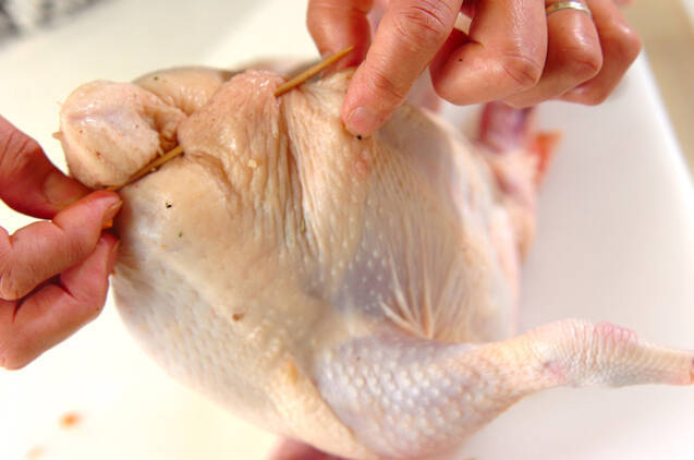 (1)の鶏肉の腹部を上にして(3)の<詰め物>を詰める。詰め終ったらおしりの部分を竹串で留め、タコ糸で縛るなどして形を整える。