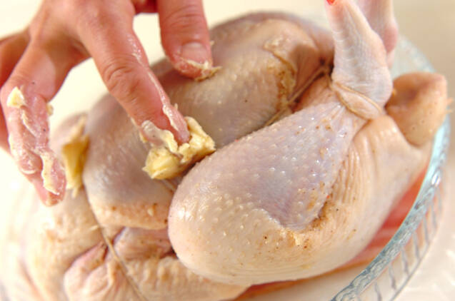 耐熱皿にベーコンを敷き、その上に(4)をのせ、塩、コショウ、すりおろしニンニク、バターをぬる。