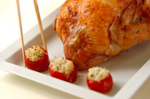 鶏肉の竹串とタコ糸を外して器に盛り、周りに<トマトのプロバンス風>と、クレソンを飾る。
