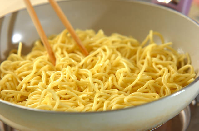 中華麺は電子レンジに1分位かけ、温める。サラダ油を熱したフライパンの中に入れ、ほぐしながら焼き色をつける。