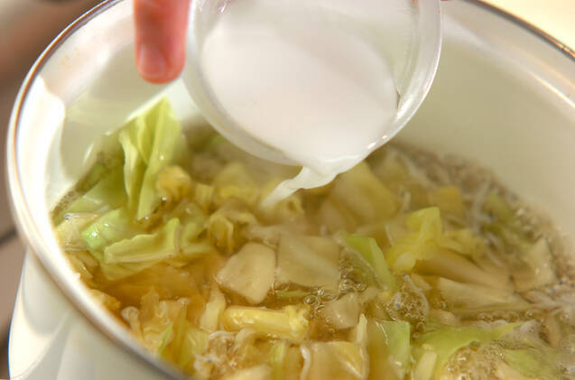 <調味料>の材料を加えたら、混ぜ合わせた<水溶き片栗>の材料をまわし入れてトロミをつける。