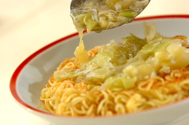 器に(2)の麺だけをのせ、(4)をかけて最後に干し桜エビを散らす。