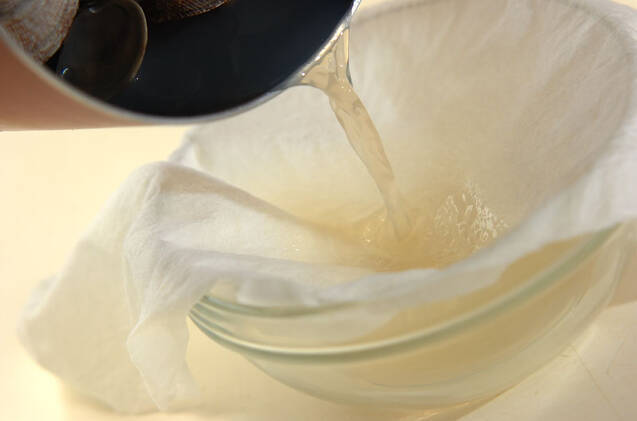 アサリは塩水で殻と殻を軽くこすりあわせて洗い、水気をきって鍋に入れ、酒を加えて蓋をし、強火にかける。口が開いたら火を止め、アサリを取り出して身を殻から外す。蒸し汁は水で濡らして絞ったキッチンペーパーでこす。