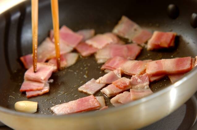 フライパンにオリーブ油、ニンニクとベーコンを入れて中火で炒める。香りが立って、こんがりしてきたらベーコンを取り出す。