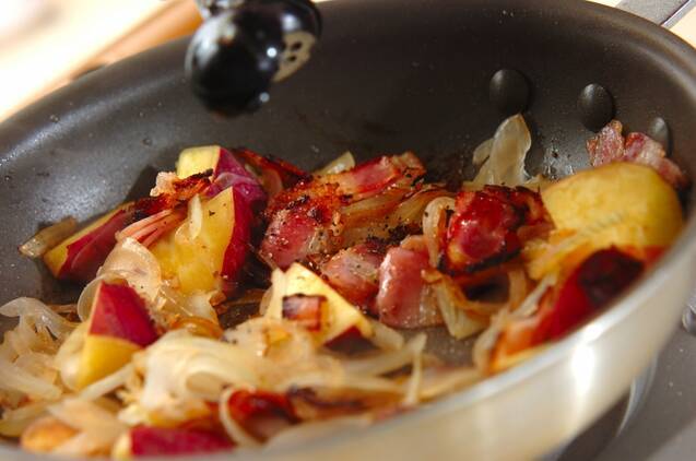 サツマイモに竹串が通ったら蓋を外して、水分を飛ばしながら炒める。ベーコンを戻し入れて、塩としっかりめに粗びき黒コショウを振る。