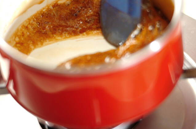 <タレ>を作る。小鍋に<タレ>の材料を全て入れ、混ぜながら弱めの中火にかけ、トロミがついたら火を止めて粗熱を取る。
