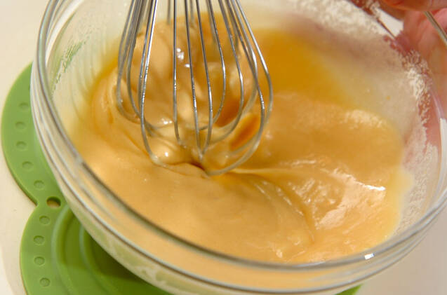 ボウルに卵、グラニュー糖を白っぽくなるまで泡立て器で混ぜ合わせ、さらにラム酒、バターを入れて混ぜ合わせる。