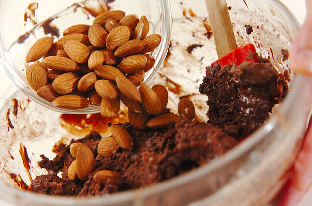 合わせて振るっておいた粉類を加え、粉っぽさがなくなるまでゴムベラで混ぜ合わせる。さらに溶かしたスイートチョコレートを混ぜ合わせ、アーモンドを加えてサッと混ぜ合わせる。