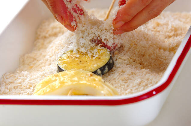 残った小麦粉を溶き卵と混ぜ合わせて固い場合は水で少し薄め、1を通してパン粉をつける。
