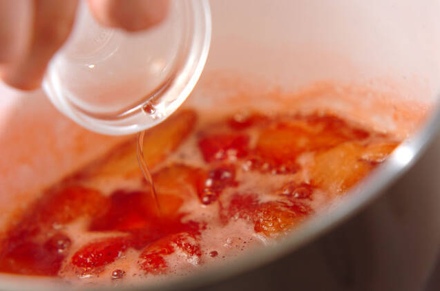<イチゴシロップ>を作る。小鍋にイチゴ、グラニュー糖、レモン汁を入れて全体を混ぜ合わせ、5分位おいてなじませる。小鍋を中火にかけ、煮たったら火を弱め、アクを取りながら煮詰める。トロッとしてきたら火を止め、粗熱が取れたらキルシュを加える。