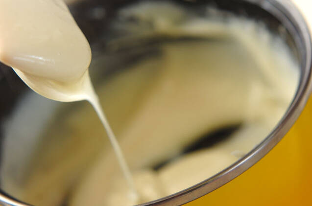 (1)に牛乳を少しずつ加えて混ぜ、トロっとするまで加熱し、卵黄、生クリーム、塩コショウを加える。