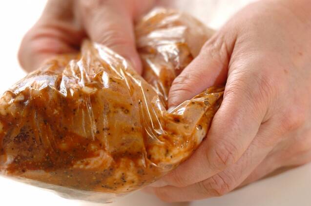 鶏手羽元は塩を振っておく。抗菌袋に鶏手羽元と<下味>の材料を加えてもみ込み、冷蔵庫で一晩おく。