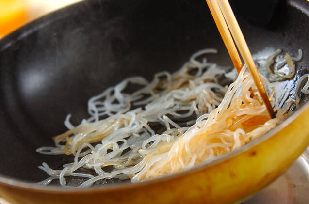 フライパンにしらたきを入れて乾煎りしながら水気をとばし、ゴマ油、しょうゆを加えて炒りつける。辛子明太子を加え、炒め合わせて器に盛り付け、刻みネギを散らす。