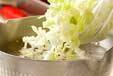 キャベツは太めのせん切りにし、塩を入れた熱湯でサッとゆでザルに上げ粗熱が取れれば水気を絞る。