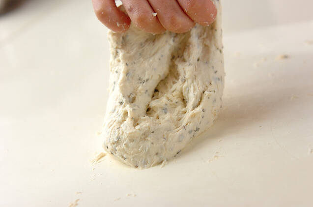 カードを使って混ぜ、生地がまとまってきたら分量外の打ち粉をした台に移し、こねる。
