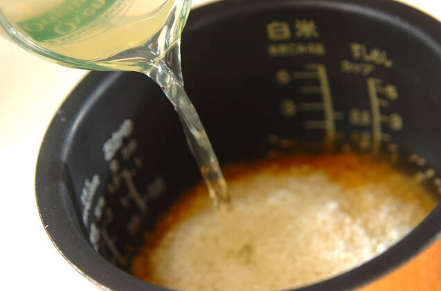 炊飯器にお米、<調味料>の材料、通常に炊く時の水量線までのだし汁を加え、ハム、レンコン、ニンジンを入れ、スイッチを入れる。