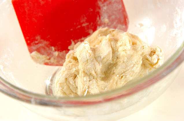 ボウルに強力粉を入れ、インスタントドライイースト、砂糖を真ん中におく。塩、溶き卵をはしにおき、温めた水70~80mlをかけ、カードでひとまとまりになるまで混ぜる。