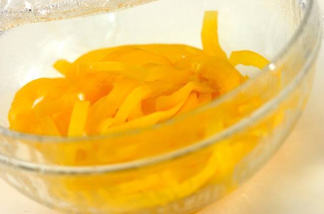 耐熱ボウルに黄パプリカを入れ、ふんわりとラップをかけて電子レンジで2分~2分30秒加熱する。