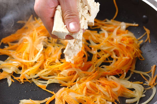 豆腐を手で崩しながら加え、木ベラで3~4分炒め合わせて水分を飛ばす。