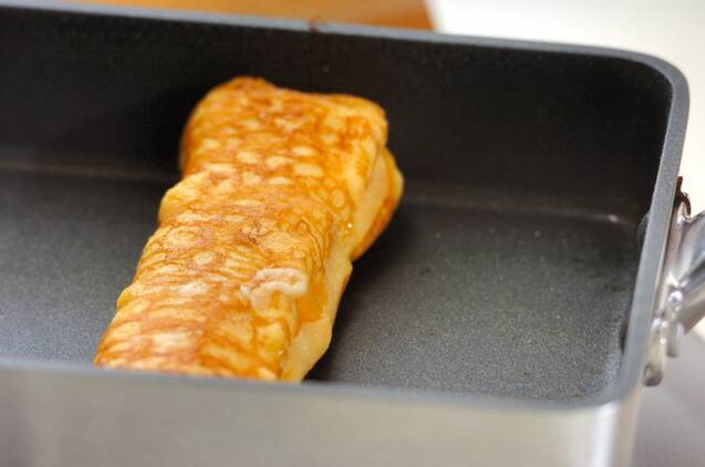 <卵焼き>の卵を割りほぐし、砂糖と塩を加えて混ぜる。卵焼き器にサラダ油を流し、中火で熱する。卵液を入れて、卵焼きを焼く。