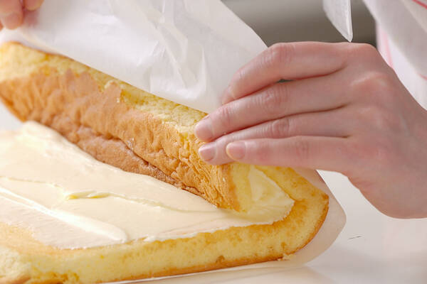4の<ロール生地>に<シロップ>を塗り、6の<レモンクリーム>を塗り広げる。手前から巻き、わら半紙でくるんで巻き終わりを下にして冷蔵庫で30~40分程冷やす。お好みの厚さにカットしていただきます。