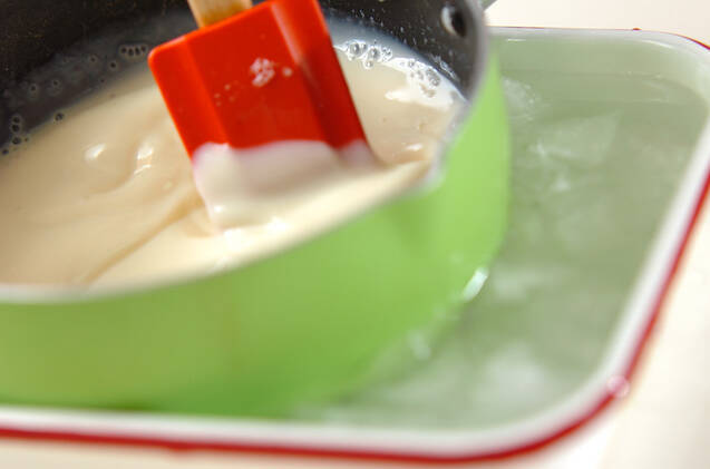粗熱が取れたら鍋底を氷水にあて、ゴムベラ等で混ぜて冷やす。トロミがついたら器に流し入れ、冷蔵庫で冷やし固める。(ヒント)冷やす時間は調理時間に含まれていません。
