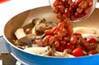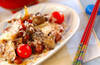しんなりしたらプチトマト、甘煮豆を加えて炒め合わせ、<調味料>を加える。ザックリからめながら炒められたら、器に盛ってかつお節を掛ける。