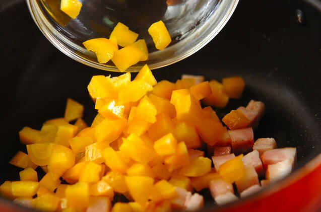 フライパンにベーコンを入れ、脂が出てきたら1cm角に切ったパプリカを加えて炒める。