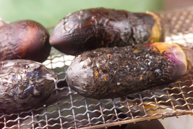 焼き網を強火で熱し、ナスを並べ、表面が真っ黒になるまで焼く。冷水にとってガクを切り落とし、焦げた皮をきれいにむく。