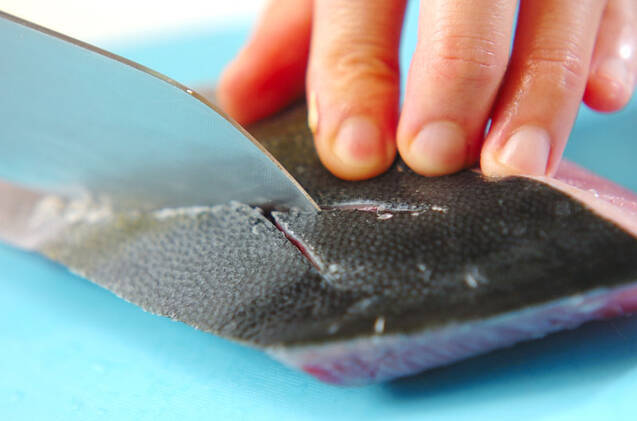 ハマチは身の厚い部分に切り込みを入れ、手に塩を持ち、20~30cm位上で指の隙間から塩を落としながら、裏表全体にまんべんなく振る。