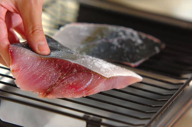 グリルの焼き網に薄くサラダ油をぬり、ハマチの皮を上にして並べ入れ、焼く。