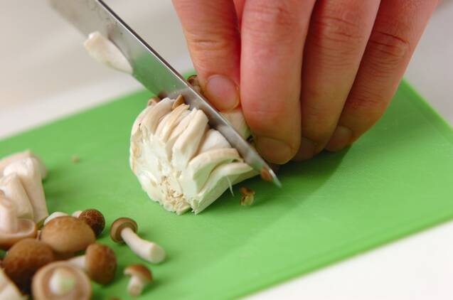 玉ネギはみじん切り、シメジは石づきを切り落とし、小房に分け、1cm幅に切る。