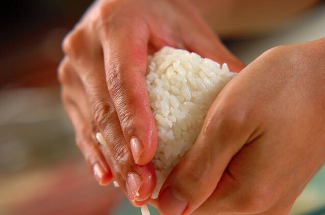 ご飯を少し冷ましてから、手を水でぬらし、三角ににぎり、分量外のサラダ油を熱したフライパンで両面に焼き色がつくまで焼く。