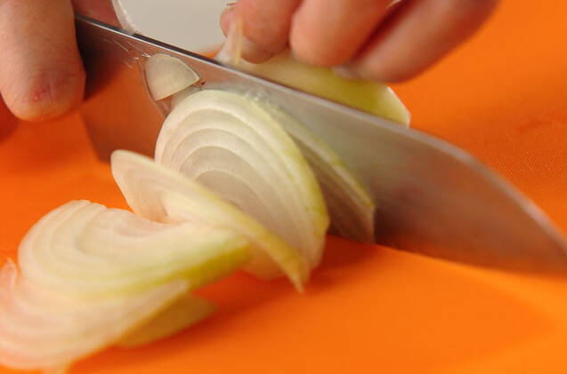 ベーコンは幅1cm、玉ネギは縦薄切り、シメジは石づきを切り落として小房に分ける。