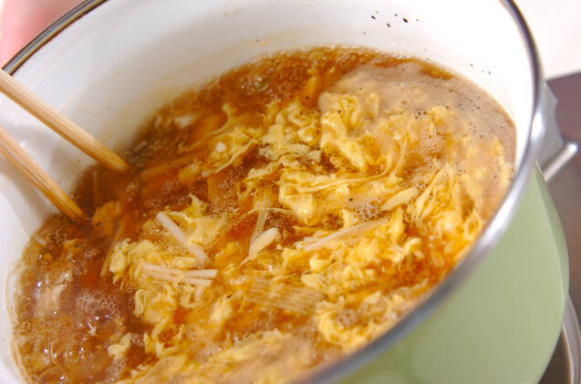 溶き卵を流し入れ、菜ばしで大きく円を描くように混ぜて、卵がふんわり浮かんできたら、火を止めて器によそう。ドライパセリを振り、お好みで粗びきコショウを掛ける。