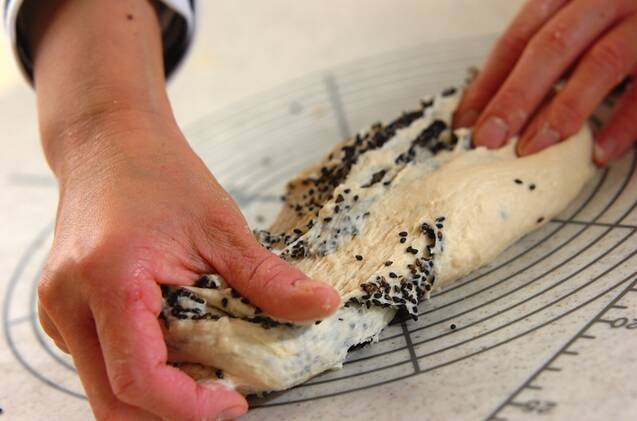 ひとまとまりになったら、無塩バターを加え、生地を台の上に出してこねる。8割ほどこねたら、生地を広げて黒ゴマをのせ、混ぜ込む。温かいところに置いて約2倍に膨らむまで待つ(30~40分)。