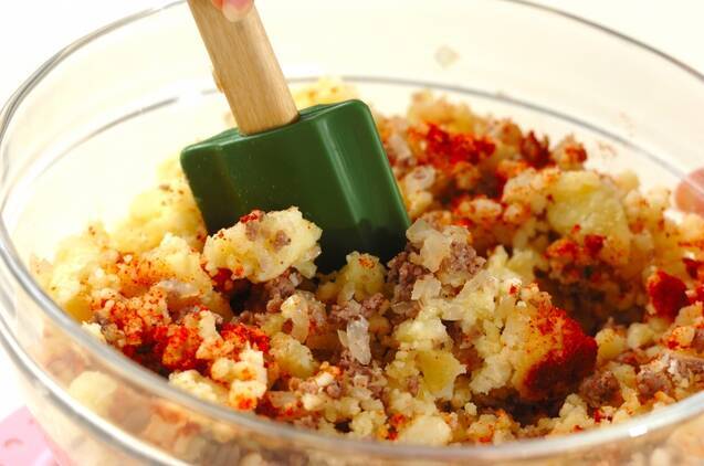 ジャガイモの粗熱が取れたら(2)と<調味料>の材料を入れ、全体に混ぜ合わせる。
